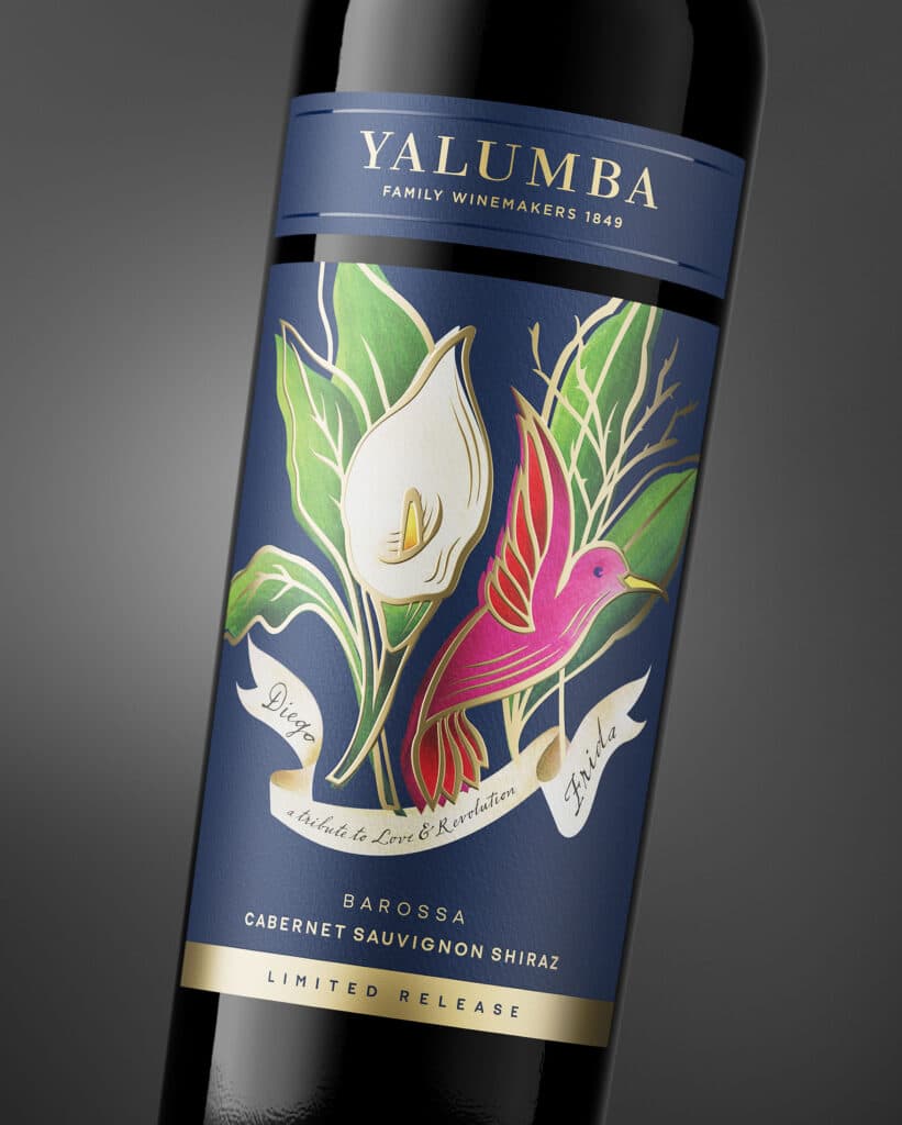 The Love & Revolution label is inspired by to the iconic works of two of the most influential and loved artists of the twentieth century – Frida Kahlo and Diego Rivera. A fusion of artists and ideas, the design is a nod to the works of Frida Kahlo and Diego Rivera. The calla lily, a symbol of working-class people in post-revolutionary México was a common thread in Rivera’s work while the hummingbird, a Mexican symbol for falling in love, appeared in Kahlo’s paintings. This illustration is a blend of the two — Kahlo and Rivera, the lily and the hummingbird, Love and Revolution. Artwork was created exclusively for Yalumba by Denomination. Gold foil, emboss and high-build screen complete the design. We’re thrilled to have printed this beautiful label for such an iconic collaboration.